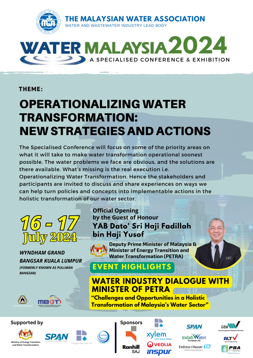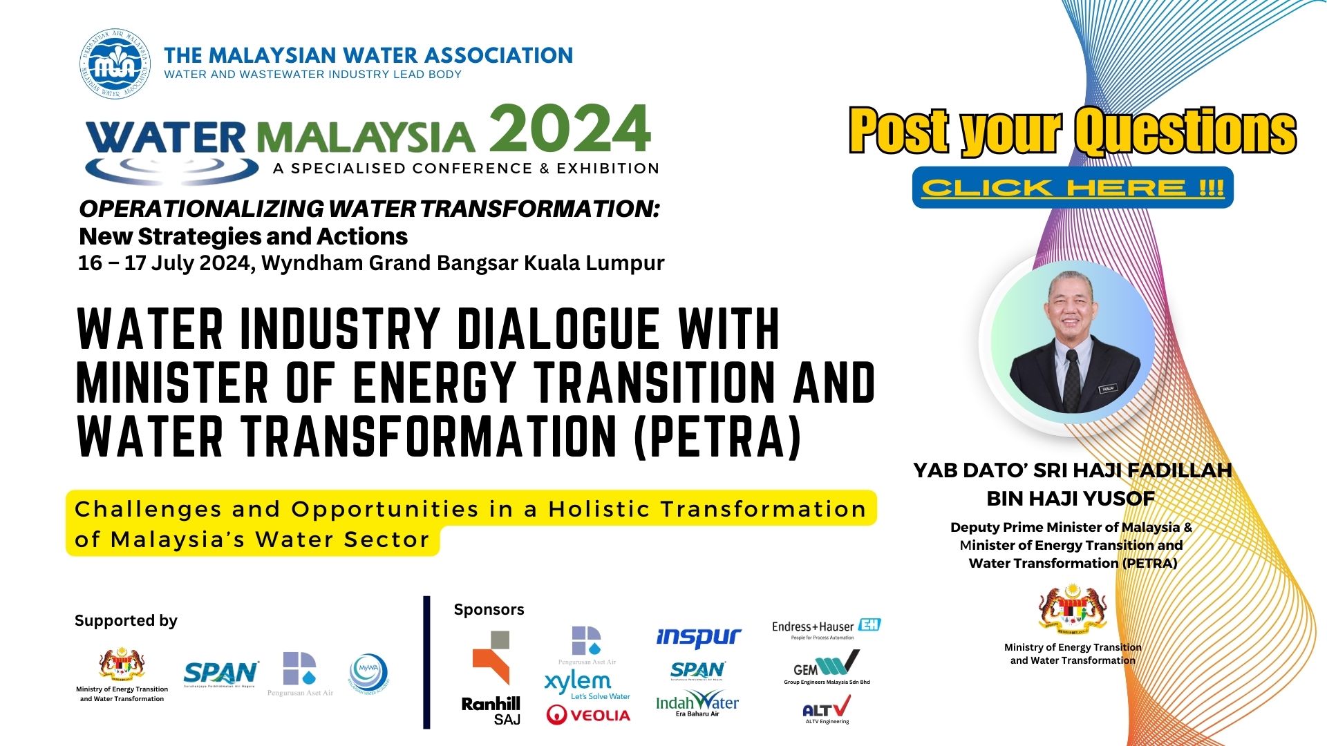 Members are welcome to send your Questions for the WATER INDUSTRY DIALOGUE WITH MINISTER PETRA in conjunction with MWA Water Malaysia 2024 Specialised Conference & Exhibition (16-17 July 2024).