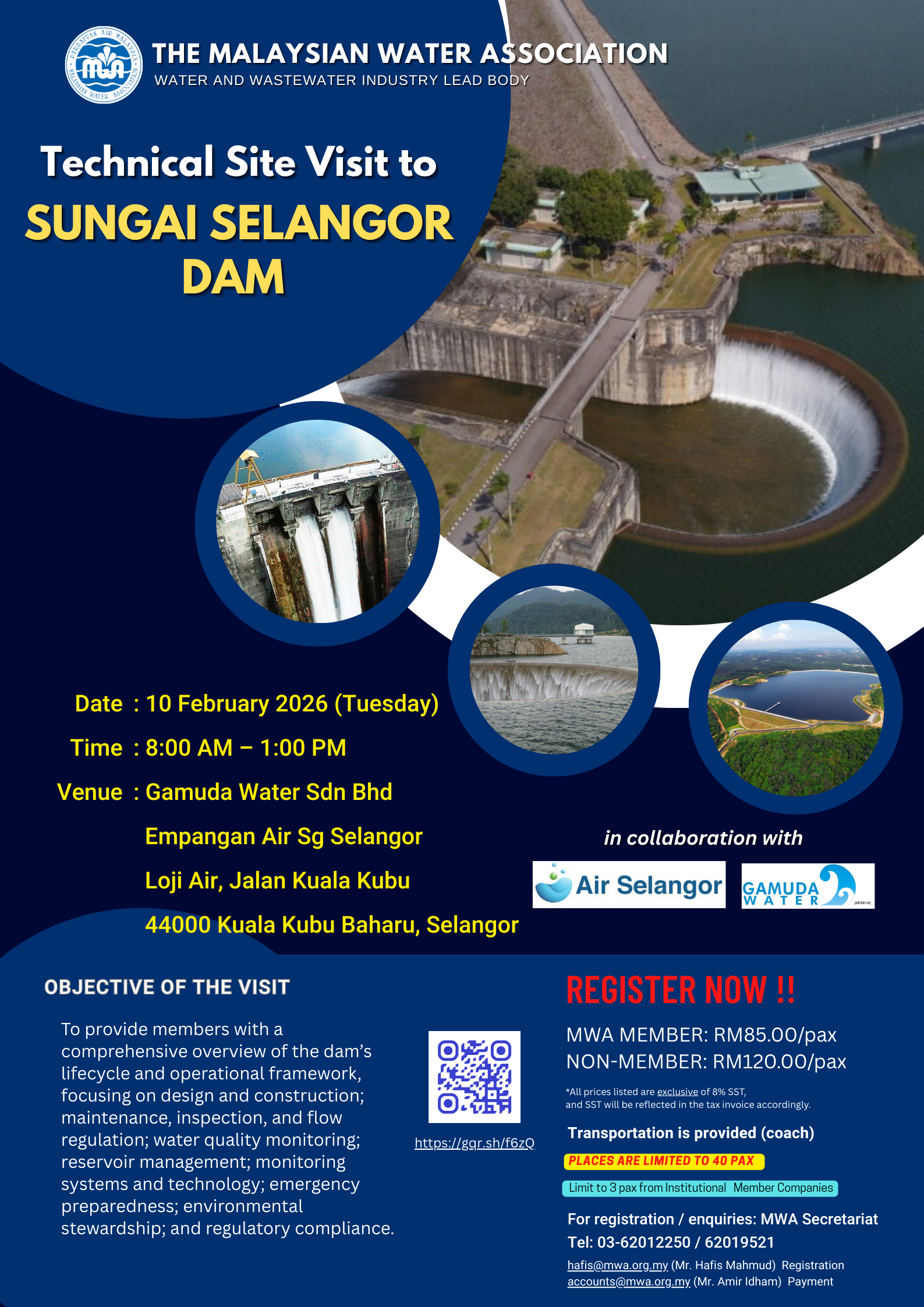 MWA Technical Site Visit to Sungai Selangor Dam Register: MWA Member :RM 91.80 (inclusive 8% SST) Non-Member :RM 129.60 (inclusive 8% SST) Date:&n... ...