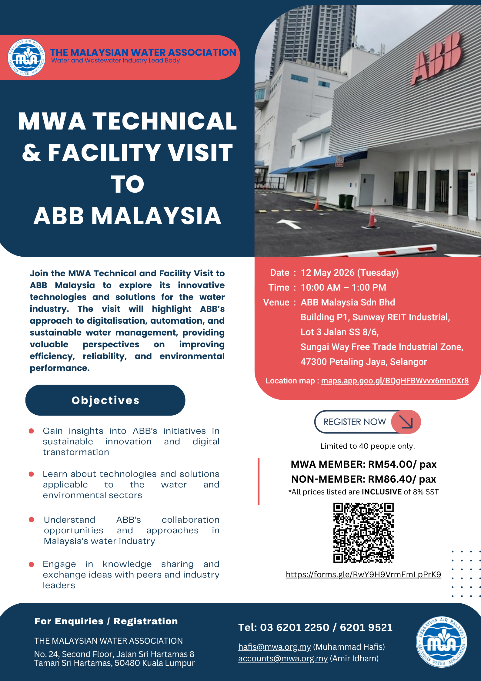 MWA Technical & Facility Visit to ABB Malaysia Register: MWA Member :RM 54.00 (inclusive 8% SST) Non-Member :RM 86.40 (inclusive 8% SST) D... ...