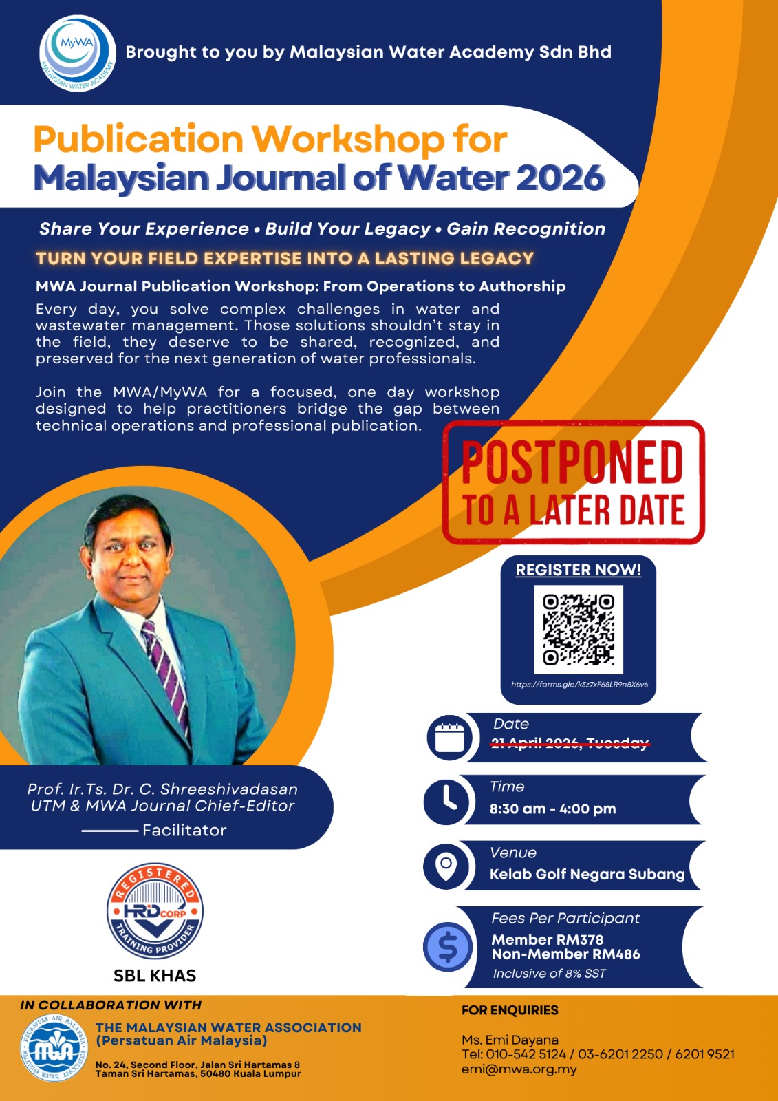 Publication Workshop for Malaysian Journal of Water 2026 Date: 21 April 2026 (Tuesday) Time: 8:30am - 4:00pm Venue: Kelab Golf Negara Subang Petal... ...