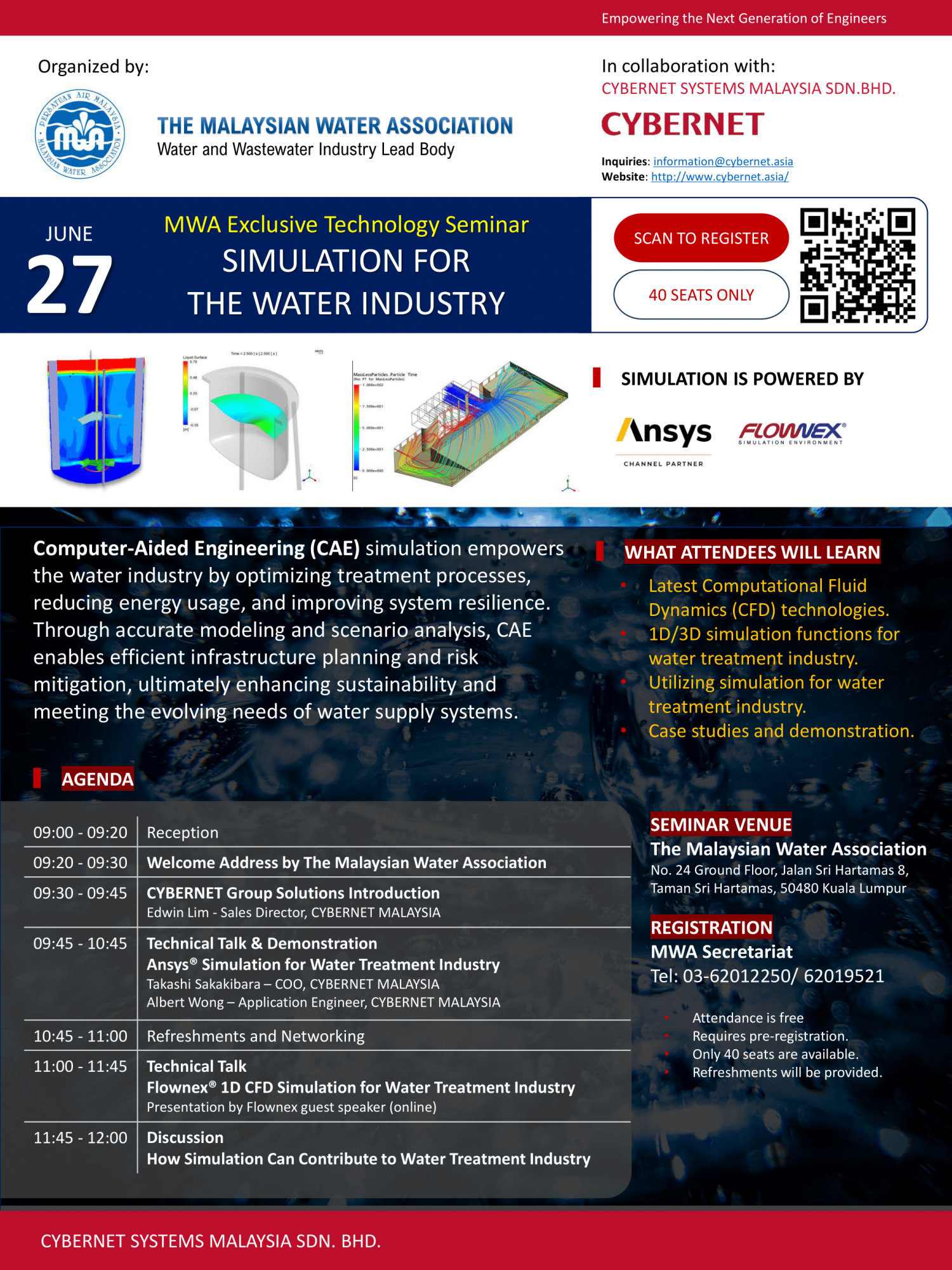 Free Registration with Limited Seat MWA Exclusive Technology Seminar SIMULATION FOR THE WATER INDUSTRY Computer-aided engineering (CAE) simulation empowers the water industry by optimizing treatment processes, reducing energy usage, and im... ...