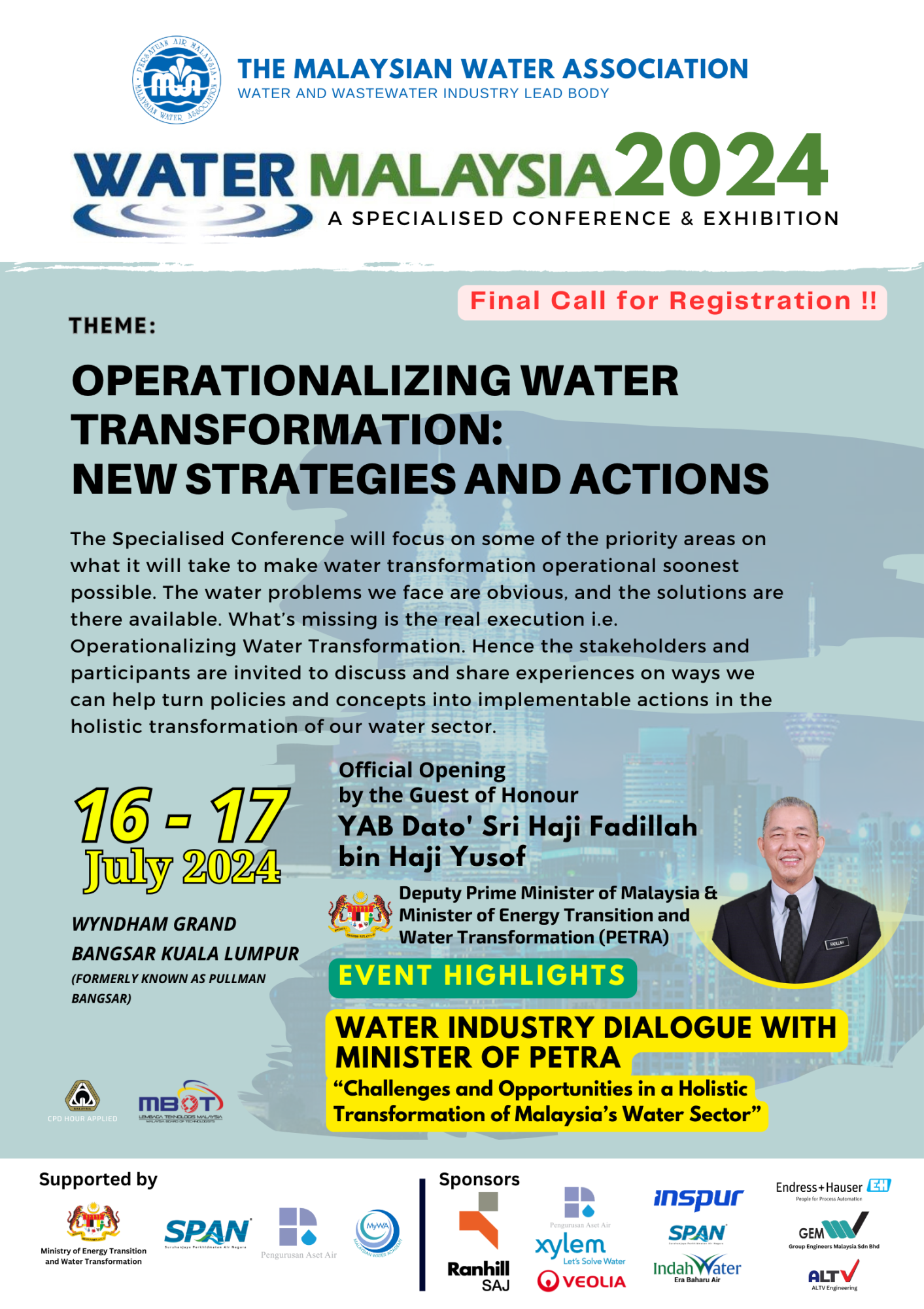 ⛳ MWA-BIWWEC 2024 INVITATIONAL GOLF 📅 Date: 22 October 2024 🕒 Tee-off: 8 am 📍 Venue: Kelab Golf Sarawak, Kuching This event will be one of the biggest networking golf in the water industry. This is a platform for MWA member... ...