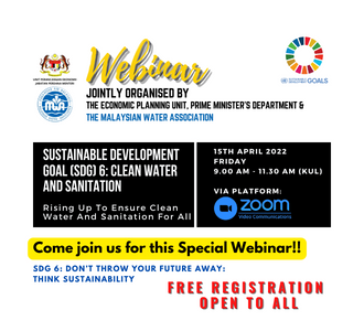 MWA Webinar 4/2022 SUSTAINABLE DEVELOPMENT GOAL (SDG) 6: CLEAN WATER AND SANITATION "Rising Up To Ensure Clean Water And Sanitation For All" Date: 15th April 2022 (Friday) Time: 9.00 am - 11.30 am (KUL) Via Zoom Platform Free R... ...