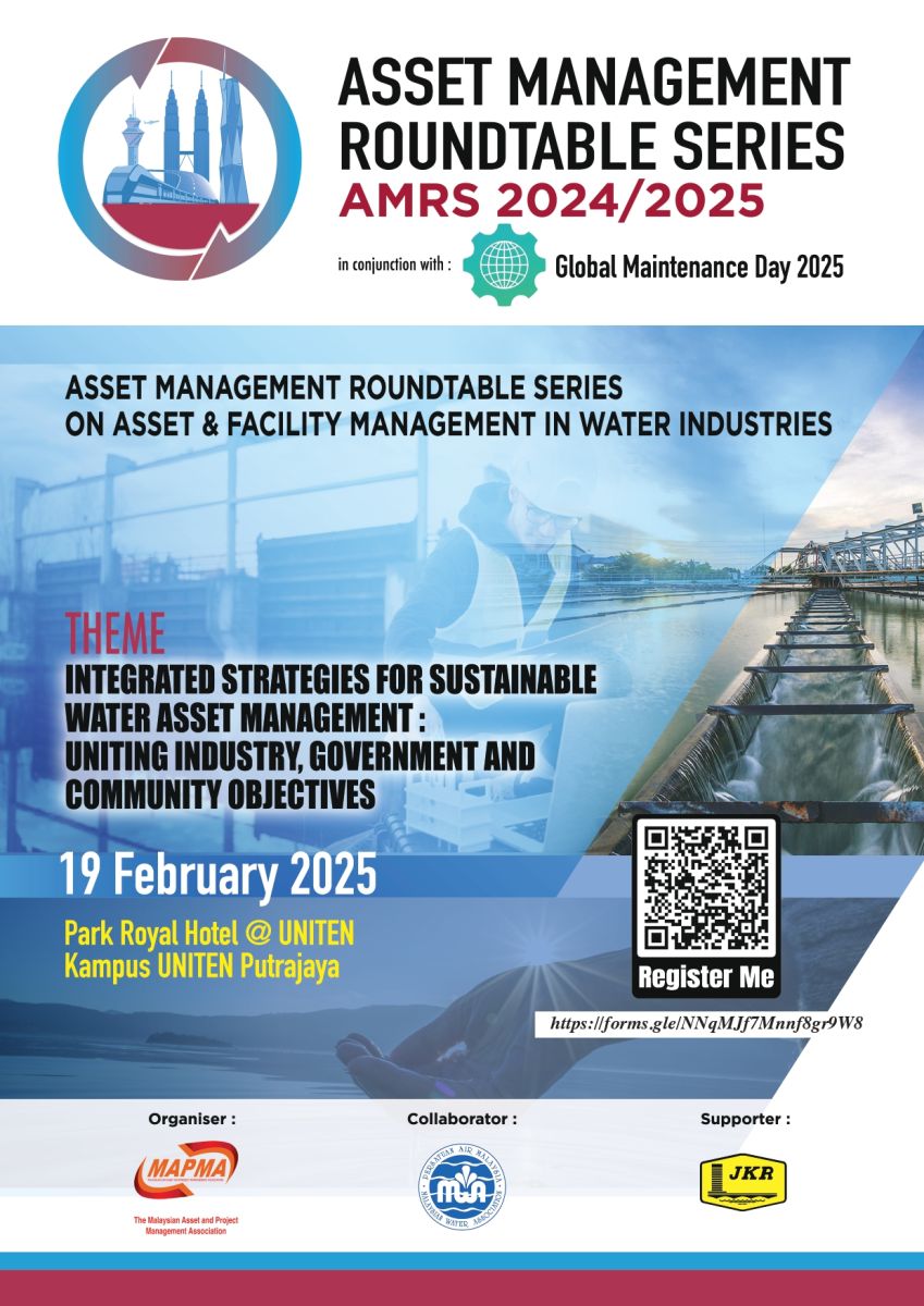 The Asset Management Roundtable Series: Asset & Facility Management in Water Industries (AMRS2024/2025) is the 2nd series of the event afterthe first one held in June 2024. With the theme “Integrated Strategies for Sustainable Water Asset Management: Uniting Industry, Government, and Community Objectives “, AMRS 2024/2025 will gather professionals in water management industry, Project Management and Asset Management experts from all over Malaysia and will be a place for exchange of ideas, networking and engaging in lively discussions on emerging topics of interest in the areas of water Management.