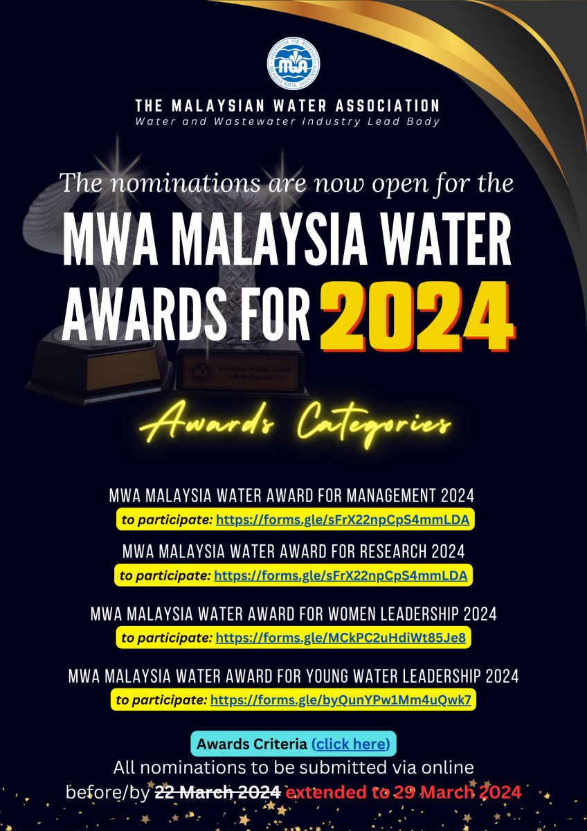 On behalf of The Malaysian Water Association (MWA), the nomination is now invited for the above MWA Malaysia Water Awards 2024 for Malaysian Individuals and Institutions / Organisations.